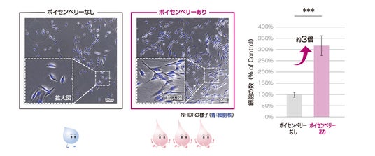 そこで我々は、ボイセンベリー果汁のさらなる美容効果を明らかにするため、NHDFの増殖への影響を検証しました。その結果、面白いことにボイセンベリーはNHDFの細胞数を有意に増加させることが分かりました。お肌の老化は細胞自体の老化のみでなく、細胞の数とも密に関連することから、ボイセンベリー果汁は元気な細胞を増やし、お肌の若々しさを維持する効果を有する可能性が示唆されました。