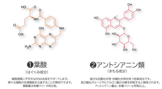 化粧品OEMを手掛ける株式会社コスモビューティー(本社 大阪市中央区 代表取締役社長 山添 隆)は「ボイセンベリー(アドベリー(R))」が含有する成分に着目し、化粧品への応用開発を行ってきました。ボイセンベリーは国内でも徐々に認知が広がっていますが、そのエキスが導く肌への美容効果はあまり知られていません。今回、我々はボイセンベリーに含まれる『はぐくみ成分(葉酸)』と『まもる成分(アントシアニン類)』(図1)による、ヒト真皮線維芽細胞(NHDF)への有用性を明らかにしました。