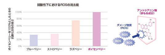 この結果から、ボイセンベリーは細胞においても、そのダメージ物質であるROSの産生を抑制する効果があることが分かりました。つまり、お肌の老化を予防する効果が期待できます。