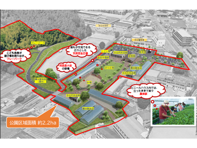 公園内は、「管理棟多目的室」「露地栽培による農体験施設」「多目的用途棟」「ビニールハウス(トレファーム(R)※1)」「芝生広場」「砂場」に分かれており、土や緑にふれあう体験や環境学習の出来る公園です。公園の管理や運営の一部に障がい者の方が関わることで、将来の社会的自立に向けた就労訓練・支援の場として活用を目指します。