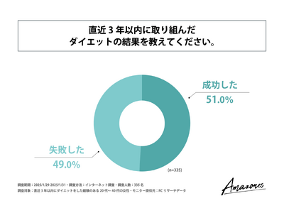 まず、「直近3年以内に取り組んだダイエットの結果」を問う設問への回答では「成功した」が51.0%、「失敗した」が49.0%という結果になりました。この結果から、20代~40代の女性のダイエットの成功率は約50%であることがわかりました。