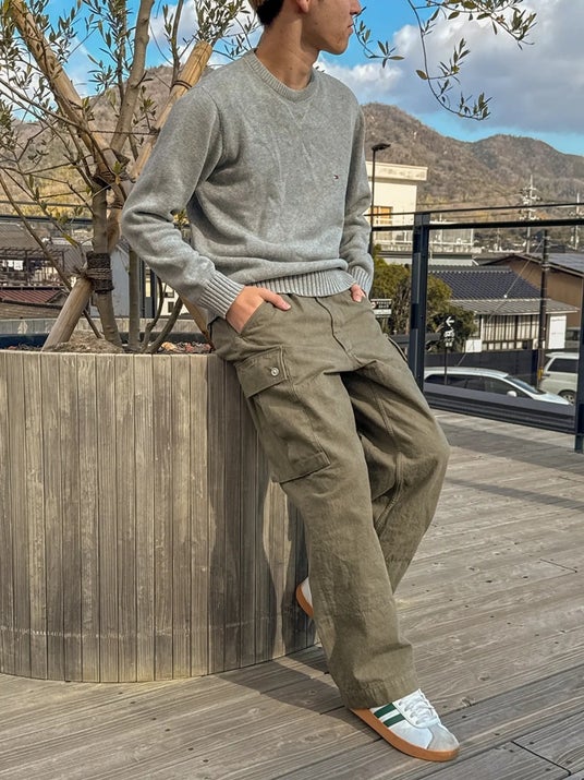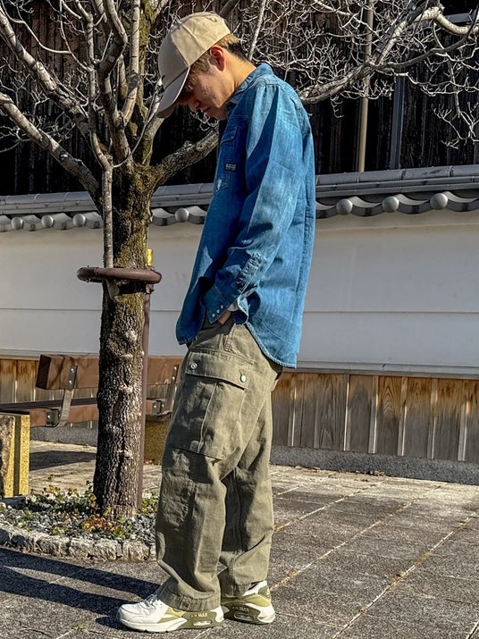 このグリーンデニムは、単なる生地ではありません。歴史的背景を持つ素材を現代の技術と感性で改良することで、過去の価値を未来へとつなぐ試みそのものです。希少性と実用性を兼ね備えたカーゴパンツが、あなたの日常に新たなスタイルを提案します。