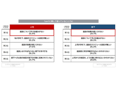 上司の第1位、部下の第2位に「面談について学ぶ仕組みがない」が入った。上司の第2位、部下の第3位には「上司が多忙で、面談のスケジュール設定が難しい」が入り、上司の第3位、部下の第1位に「面談の効果が感じられない」が入った。上司、部下ともに1on1について手探りのまま行われている実態が明らかになった。
