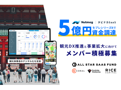 旅行・レジャーにおける観光事業者向けのタビナカDXプラットフォーム「Nutmeg(ナツメグ)」を提供するNutmegLabs Japan株式会社(代表取締役:中口 貴志、本社:東京都千代田区、以下「当社」)は、約5億円のプレシリーズB資金調達を実施したことをお知らせいたします。