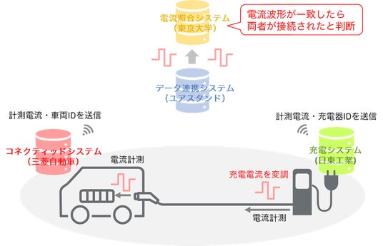 今回の実証実験では、日東工業のMode3普通充電器『Pit-2G』から送信される充電電流と、三菱自動車の軽商用EV『ミニキャブEV』(以下、ミニキャブEV)等からコネクティッド技術(以下コネクティッドシステム)を用いて送信される充電電流をユアスタンドが構築したシステムで連携し、東京大学のシステムで2つのデータを照合する仕組みを各者共同で構築しました。