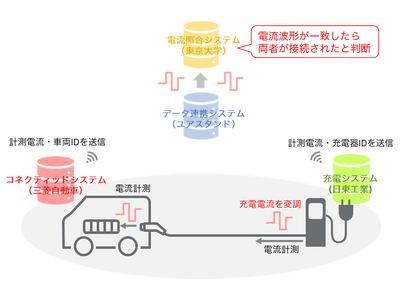 この仕組みでは、EVに充電プラグが挿しこまれた際に、充電器とEVから送信された電流データ(電流波形)を照合して、データが一致した場合に自動で充電が始まります。