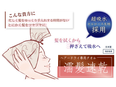 「濡髪速乾」タオルは、髪を拭くのではなく、押さえて水分を吸収する画期的なヘアードライ専用タオルです。