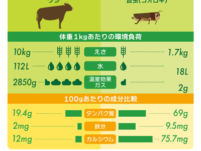 昆虫と畜産、タンパク質1kg生産するのに必要な資源を比較すると、昆虫が圧倒的に有利であるとされています。