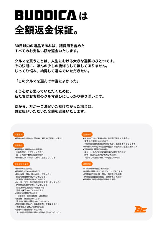 2025年3月1日(土)よりバディカダイレクト、およびバディカ店舗でクルマを購入後、納車から30日以内の購入キャンセル(返品)には数料・税金など含めての全額返金保証を決定しました。なお今回の決定は全国のバディカ店舗(URL: https://www.buddica.jp/)でも同様に実施させていただきます。