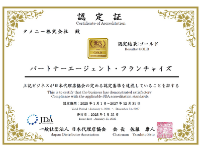 タメニー株式会社(本社:東京都品川区、代表取締役社長:栗沢研丞、証券コード:東証グロース6181)が運営する結婚相談所「パートナーエージェント」のフランチャイズ展開は、この度、一般社団法人日本代理店協会が行う「優良ビジネス認定2025」においてゴールド認定を受賞いたしましたので、お知らせいたします。