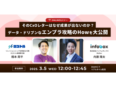 リレーションシップ合同会社(以下「ロゴトル」)はインフォボックス株式会社(以下「インフォボックス」)と共催で、エンタープライズ企業をターゲットにした営業に取り組む方向けに、無料オンラインセミナーを開催いたします。