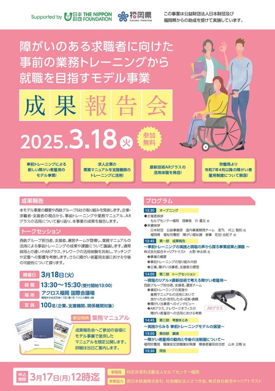 特定非営利活動法人セルプセンター福岡(福岡県大牟田市、理事長:叶 義文、以下:セルプセンター福岡)は、2024年4月より、「障がいのある求職者に向けた事前の業務トレーニングから就職を目指すモデル事業」を実施してまいりました。この度、1年に及ぶ本事業の成果報告会を、3月18日(火)13時30分から15時30分にて、アクロス福岡国際会議場で開催いたします。また、当日の参加特典として、ARグラスの試用やモデル事業で活用した業務マニュアルを限定公開します。
