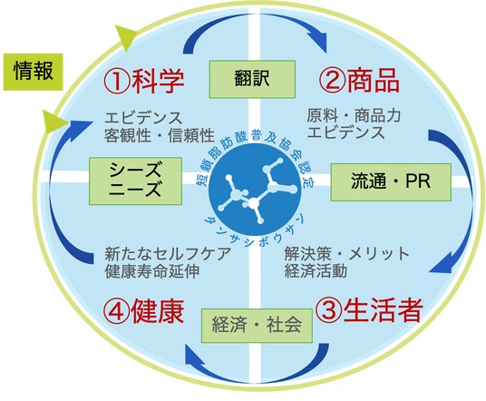 この度、運用を開始する「短鎖マーク」をこのエコシステムの核と位置づけ、本協会は短鎖脂肪酸に関する情報発信と生活者の課題解決に繋がる商品情報のどちらの普及も強化していきます。