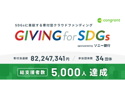 ソーシャルセクターと企業向けに「寄付DXシステム」を提供するコングラント株式会社(本社:大阪市西区、代表取締役:佐藤正隆、以下「コングラント」)は、ソニー銀行株式会社(代表取締役社長:南 啓二/本社:東京都千代田区)の協賛で運営するSDGsを推進するNPOのクラウドファンディングを支援するプログラム「GIVING for SDGs」にて、総支援者数5,000人を突破したことをお知らせします。