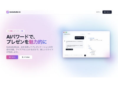 「SUGUKURU AI」は、AIアシスタントに話しかけるだけで企画や構成を自動生成し、モダンでスタイリッシュなデザインのプレゼンテーション資料を瞬時に作成できるサービスです。今後、正式版の公開に向けて、機能拡充とユーザーフィードバックの反映を進めてまいります。