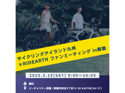 サイクリングアイランド九州実行委員会は、電動アシスト自転車ブランドRIDEARTH、イーチャリティ那覇と連携し、ファンミーティングを開催。最新E-bikeへの試乗やガイドツアーを楽しんでいただけます。