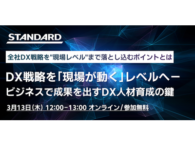 大手企業を中心に1,000社以上のデジタルトランスフォーメーション(以下、DX)の推進と内製化を支援する株式会社STANDARD(本社:東京都港区、代表取締役社長:伊藤 海)は、3月13日(木)12時より、Webセミナー『DX戦略を「現場が動く」レベルへ-ビジネスで成果を出すDX人材育成の鍵』を開催いたします。