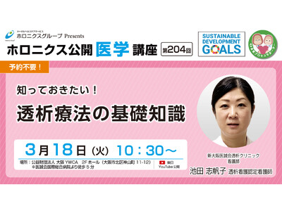 医療法人医誠会(大阪府大阪市 代表者:谷 幸治)は、第204回ホロニクス公開医学講座 『知っておきたい!透析療法の基礎知識』を、2025年3月18日(火)に公益財団法人 大阪YWCA (大阪市北区神山町11-12)で開催いたします。