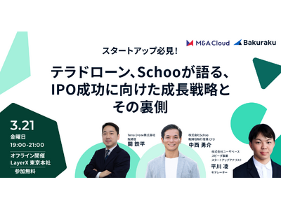 求人広告型のM&Aマッチングプラットフォーム「M&Aクラウド」や事業会社・CVCからの資金調達ができる「資金調達クラウド」を運営する、株式会社M&Aクラウド(本社:東京都千代田区、代表取締役CEO:及川 厚博、以下「当社」)は、法人支出管理・勤怠管理などの業務効率化クラウドサービス「バクラク」を運営する株式会社LayerX(本社:東京都中央区、代表取締役CEO:福島 良典、以下「LayerX」)と共催で3月21日(金)にスタートアップ企業向けのイベントを開催します。ゲストには、2024年に東証グロース市場に上場をしたTerra Drone株式会社 取締役 関氏、株式会社Schoo 取締役執行役員 CFO 中西氏をお招きし、IPOまでの成長戦略や準備についてトークセッションを繰り広げます。モデレーターは、株式会社ユーザベース スピーダ事業 スタートアップアナリスト 平川氏が担当します。