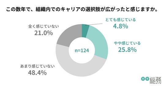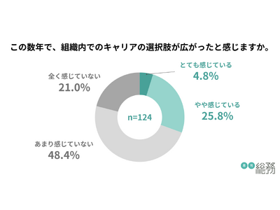 この数年で組織内でのキャリアの選択肢が広がったと感じるか尋ねたところ、約7割がキャリアの選択肢が広がっていないと考えていることが明らかになりました(n=124)。