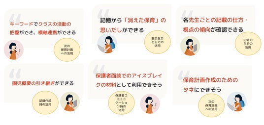- 連絡帳や帳票の内容があがってくるので、その子の成長の道筋が出てくる。(私立園・担任)