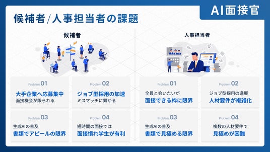 近年、大手企業への応募が集中し、多くの候補者が書類選考で落とされ、面接で自分をアピールする機会を得られないケースが増えています。特にジョブ型採用の加速により、専門スキルの適合度が求められる一方、候補者は限られた情報の中で適性を適切に伝えることが難しく、ミスマッチが生じやすい状況です。さらに、生成AIの普及でESの内容が均質化し、短時間の面接では面接慣れした候補者が有利になる傾向もあります。