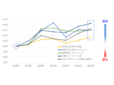ストレスチェックでは、ストレスの状態だけでなく、ストレスの原因(ストレッサー)についても測定している。測定される9項目――「心理的な仕事の負担(量)」「心理的な仕事の負担(質)」「自覚的な身体負担度」「職場の対人関係でのストレス」「職場環境によるストレス」「仕事のコントロール度」「あなたの技能の活用度」「あなたが働いている仕事の適性度」「働きがい」――について7年前(2018年)と2024年を比較したところ、ほとんどの項目が長期的には良化あるいは同水準で推移するなか、唯一、自分の持っている技術や知識、資格などが仕事で活用されていることを示す「あなたの技能の活用度」のみ、長期的に悪化していた。