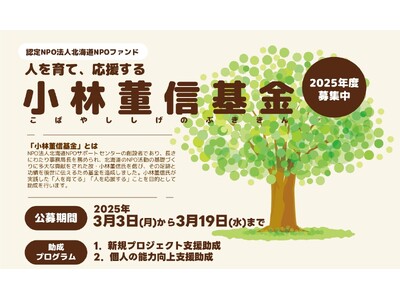 認定NPO法人北海道NPOファンドでは、NPO法人北海道NPOサポートセンターの事務局を長きにわたり務められ、北海道のNPO活動の基礎づくりに多大な貢献をされた故・小林董信氏を偲び、その足跡と功績を後世に伝えるために基金を造成し、小林董信氏が実践されていた「人を育てる」「人を応援する」ことを目的とした助成を行います。今年度で3度目の公募となります。