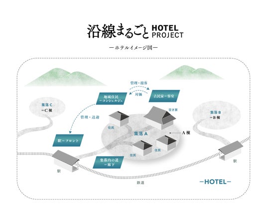 「沿線まるごとホテル」プロジェクトは、駅とその周辺の集落に点在する地域資源を”編集”し、地域全体を”一つのホテル”に見立てた世界観をつくりだすプロジェクトです。JR東日本の駅舎や鉄道施設などを「ホテルのフロント」として活用、沿線集落の古民家(空き家)を「ホテルの客室」に改修、さらには地域住民を「ホテルのキャスト」として接客・運営を行うことで、「沿線」を「まるごと」楽しめる「ホテル」の世界観を構築し、新たな滞在型観光及び、沿線の地域活性化を図るものです。