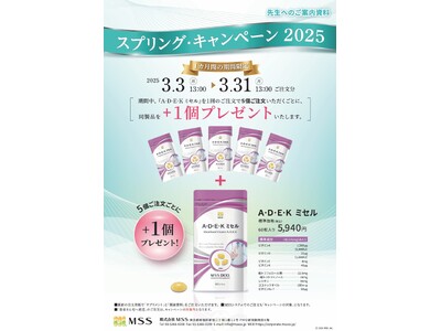 医療機関専用サプリメントの開発・製造・卸販売のほか、医療機関におけるオーソモレキュラー栄養療法の導入・実践をトータルサポートする株式会社MSSでは、2025年3月3日(月)13:00~3月31日(月)13:00まで、「スプリング・キャンペーン 2025」を開催しています。