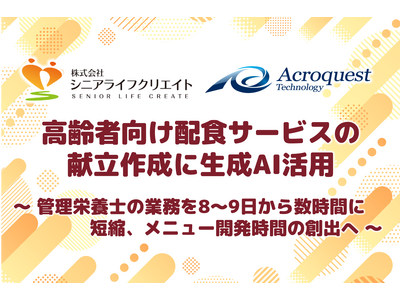 アクロクエストテクノロジー株式会社(本社:神奈川県横浜市・代表取締役:新免流、以下、アクロクエスト)は、株式会社シニアライフクリエイト(以下、シニアライフクリエイト)様向けに、生成AIを活用した献立自動検討システムを提供し、管理栄養士の業務効率化を実現しました。