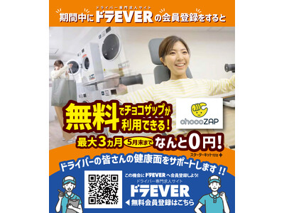 期間中に求人サイト「ドラEVER」で会員登録をされた方、全員を対象にコンビニジム「chocoZAP」(チョコザップ)の全国1,787店舗※1、最大3か月無料で利用できるクーポンコードをプレゼントいたします!chocoZAPが最大3か月(5月末)まで無料で使用可能。