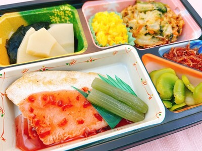 3月のご馳走の日は、うららかな春の陽気を感じながら、季節の食材を詰め込んだ「お食事」を召し上がっていただきたいとの想いから、「梅香る春の訪れ彩り弁当」をお届けします。春の訪れを告げる「梅」を使用したソースで味わう「カレイの梅ソースがけ」をメインに、春を代表する食材の筍や菜の花、そら豆、ふきを盛り込み、お花見旅行に出かけた時の気分も味わっていただけるよう、彩り豊かで華やかなお弁当に仕上げました。