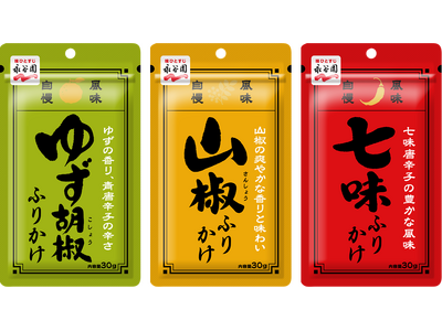 メニューは「ゆず胡椒」「山椒」「七味」。メニューカラーに墨の筆文字を配しただけのシンプルなパッケージデザインが目印です。