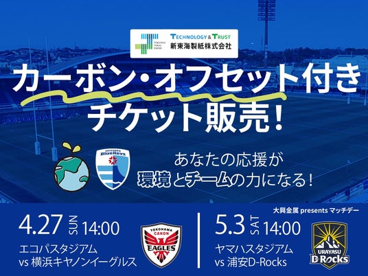 また、静岡ブルーレヴズの応援と合わせて、地域住民やファンの方にも環境アクションに参加できる取組みとして、新東海製紙株式会社(本社:静岡県島田市、代表取締役:大竹 一広)のご賛同・サポートによる「新東海製紙カーボン・オフセット付きチケット」の販売も実施いたします。カーボン・オフセット付きチケットの販売は、ジャパンラグビー リーグワンでは初の試みとなります。