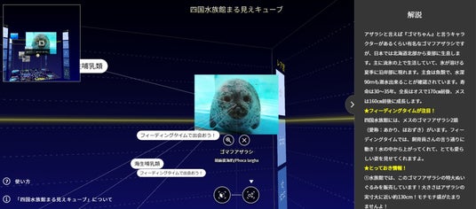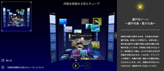 四国水族館のコンセプトである展示テーマ「四国水景」*6に関して、香川大学の学生が来場者にアンケートを実施しました。多くの人は同館のWebサイトやSNSの閲覧後に来場していながら、コンセプトへの理解が不十分であることがわかりました。この結果を受けて、「四国水景」への理解を促す「みどころキューブ」をオンラインで公開・発信することにしました。