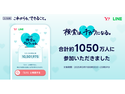 LINEヤフー株式会社(以下、LINEヤフー)は、東日本大震災および能登半島地震・豪雨の被災地支援や、震災の風化防止、未来の防災行動につなげる企画「3.11 これからも、できること。」を2月28日より実施しました※1。本企画内で実施した「3.11 検索は、チカラになる。」には合計約1050万人※2に参加いただき、寄付の上限額である5000万円を東日本大震災および能登半島地震・豪雨の被災地支援に取り組む団体にLINEヤフーから寄付します。また、その他の寄付施策を含めると、本企画を通じた寄付総額は約5837万円に達しました。
