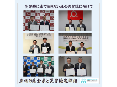 この協定により、協会は東北6県全て(青森・秋田・岩手・宮城・山形・福島)と災害時の支援連携に関する協定を締結しました。全国で頻発する自然災害での被災地では、突如車が水没し生活に不自由さを抱える方が災害の度に発生しています。協会では、被災された方へ、より迅速な支援を実施するための体制を築くため、自治体と支援連携に関する協定の締結を進めています。協会は東日本大震災をきっかけに生まれた東北発のこの支援を、これからも都道府県をはじめとする自治体との連携を広げることで、災害時に車で困らない社会の実現に向けて取組を進めてまいります。