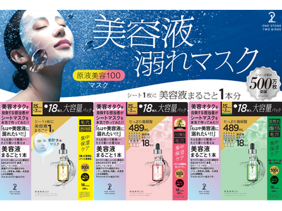 美容ブランド『ONE STONE TWO BIRDS』は、発売以来SNSや店頭でも人気爆発中の美容マスクシリーズ「原液美容100マスク」より、通常サイズの2.5倍となる大容量パックを発売いたします。全国のドラッグストアでは、2025年3月15日(土)以降、店頭で順次発売いたします。