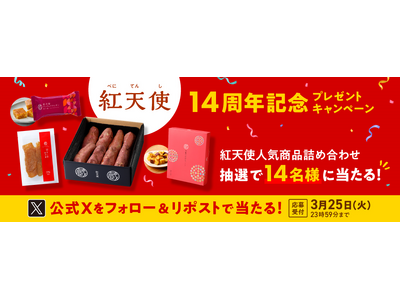 カルビーかいつかスイートポテト株式会社(本社:茨城県かすみがうら市、代表取締役社長:安藤 國行)は、3月25日に自社のオリジナルブランドさつまいも・紅天使(べにてんし)の商標登録から14周年を迎えることを記念して、公式Xにて紅天使の人気商品詰め合わせが当たるプレゼントキャンペーンを実施いたします。応募期間は2025年3月17日から3月25日までです。