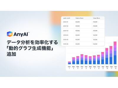 AnyMind Group株式会社(読み:エニーマインドグループ、代表取締役CEO:十河 宏輔、以下「当社」)は、データ&AI統合活用プラットフォーム「AnyAI」に「動的グラフ生成機能」を追加しました。専門的なプログラミングやクエリ(*1)の知識がなくても、自然言語でデータ分析を依頼し、瞬時にグラフや表といったビジュアルレポートを生成できます。企業の業務効率の向上と、迅速な意思決定を支援します。