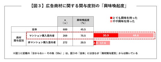 「マンション購入意向者」と「非マンション購入意向者」の2つの属性グループでクロス集計を行うと、「マンション購入意向者」の興味喚起度は、75.5%と高い結果に。「非マンション購入意向者」の20.5%と比べると、実に3.6倍以上もの興味喚起度になります。
