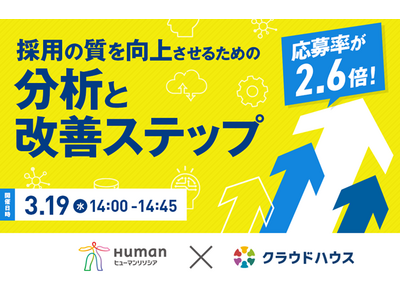 人材採用のためのサイト制作・集客・管理をオールインワンで支援するサービス『クラウドハウス採用』を運営する株式会社Techouse(本社所在地:東京都港区、代表取締役:礒邉基之、以下「Techouse」)と総合人材サービスを提供するヒューマンリソシア株式会社(本社所在地:東京都新宿区、代表取締役:高橋哲雄、以下「ヒューマンリソシア社」)は、セミナーシリーズの第7弾として「応募率が2.6倍!採用の質を向上させるための分析と改善ステップ」を3月19日(水)にオンラインで開催します。