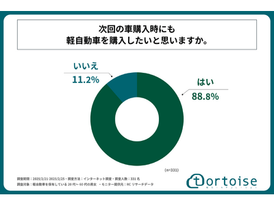 調査の最後、「次回の車購入時も軽自動車を購入したいと思うか」を問う設問への回答では、「はい」が88.8%、「いいえ」が11.2%という結果になりました。この結果から、軽自動車ユーザーの約9割が、次回の車購入時も軽自動車を購入したいと考えていることがわかりました。