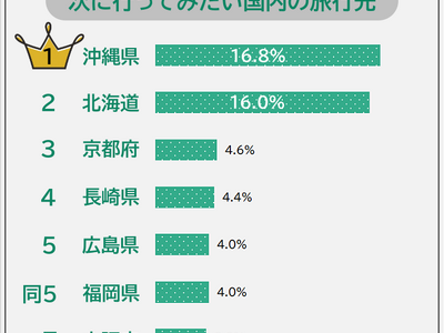 全国の男女500人に「次に行ってみたい国内の旅行先」を聞いたところ、1位は沖縄県(16.8%)」、僅差の2位は「北海道(16.0%)」でした。