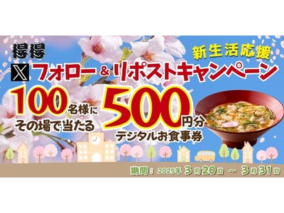 株式会社家族亭(本社・大阪府大阪市、代表取締役社長・坪山 憲司)が運営するうどんチェーン「得得(とくとく)」は、2025年3月20日(木)午後8時~3月31日(月)の期間に得得公式Xで「得得デジタルお食事券500円分」が100名様にその場で当たる「新生活応援!Xフォロー&リポストキャンペーン」を実施いたします。得得の公式Xをフォローし、キャンペーンポストをリポストすることで参加ができ、その場で抽選結果が分かります。「得得デジタルお食事券」は、得得の店内飲食、テイクアウトでご利用いただけます。4月からの新生活に向けて、何かと忙しくなるこの季節だからこそ、得得でさっと腹ごしらえのお食事をどうぞ。