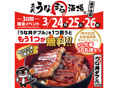 3月24日(月)に南千住店が新オープン。「うな丼ダブル」を1つ買うと1つ無料に!