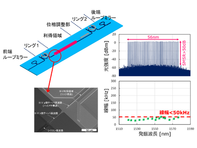 デジタルコヒーレント伝送※4向け波長可変レーザは、広い波長可変域で位相雑音を抑制するため、狭発振スペクトル線幅が求められます。図1に示すUVオゾン親水化によるInP小片/シリコン基板接合と、図2に示すInP系二段テーパ導波路とシリコン導波路から成る光結合部を用いて、InP系利得領域とシリコン光回路をモノリシック集積した構成により、従来のInP系集積レーザでは実現が困難であったフルCバンド(波長: 1530 nm - 1565 nm)を超える広い波長可変域において、単一モード・狭スペクトル線幅を実現しました(図2)。