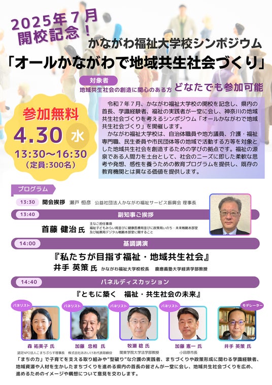 令和7年7月に開校するかながわ福祉大学校を記念し、シンポジウムを開催します。県内の首長、学識経験者、福祉の実践者が一同に会し、神奈川の地域共生社会づくりを考えます。