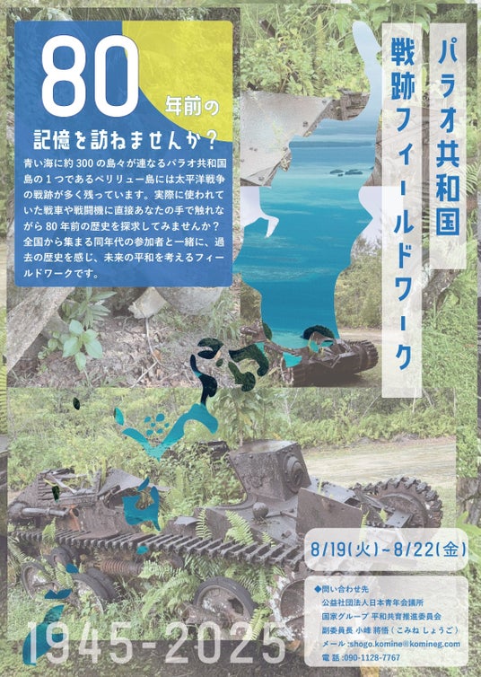 今回は第2弾として、2025年8月19日(火)から8月22日(金)に、高校生と大学生を対象とした「パラオ共和国戦跡フィールドワーク」をパラオ共和国のペリリュー島で実施いたします。